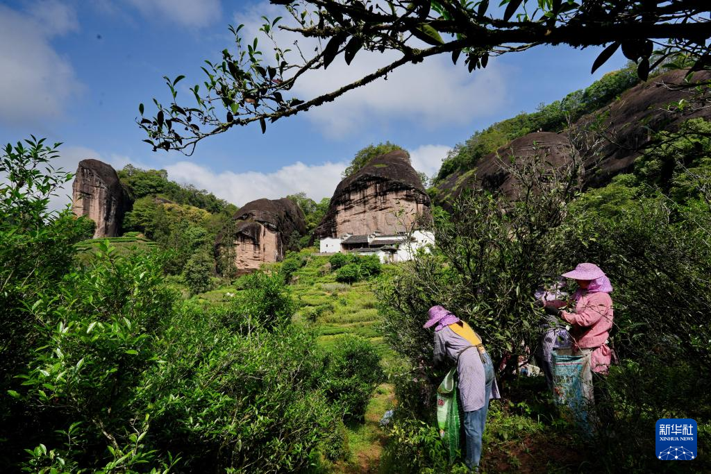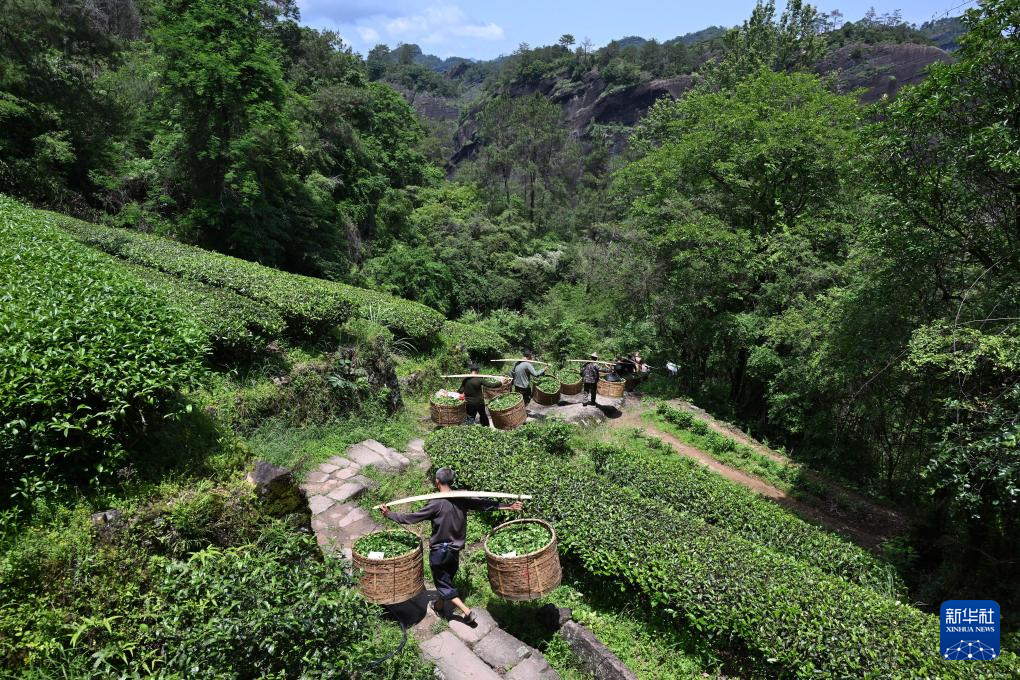 初夏的武夷山,云雾缭绕,溪水潺潺。丹霞碧水间一块块葱郁的茶园内,茶农们背着竹篓,指尖轻轻掐下鲜嫩的叶芽。山道上,挑茶的工人穿梭往来,将新鲜茶叶及时送往加工坊。