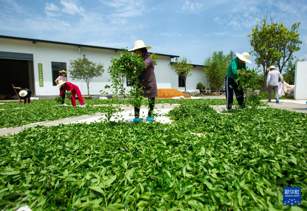 5月7日,工人们在武夷山陶渊明有机茶厂晾晒茶青。