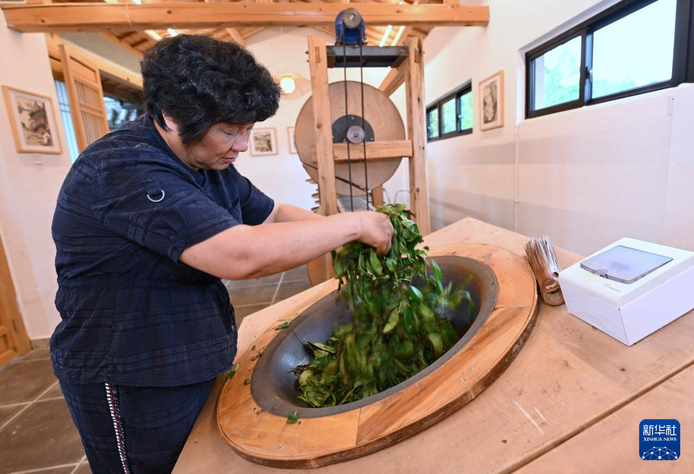 5月7日,国家级非物质文化遗产武夷岩茶(大红袍)制作技艺省级代表性传承人游玉琼展示岩茶揉捻工艺。