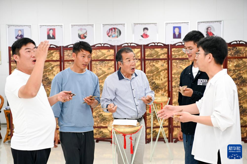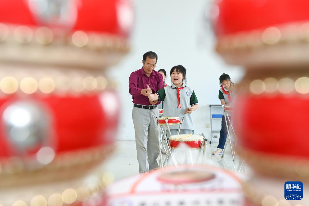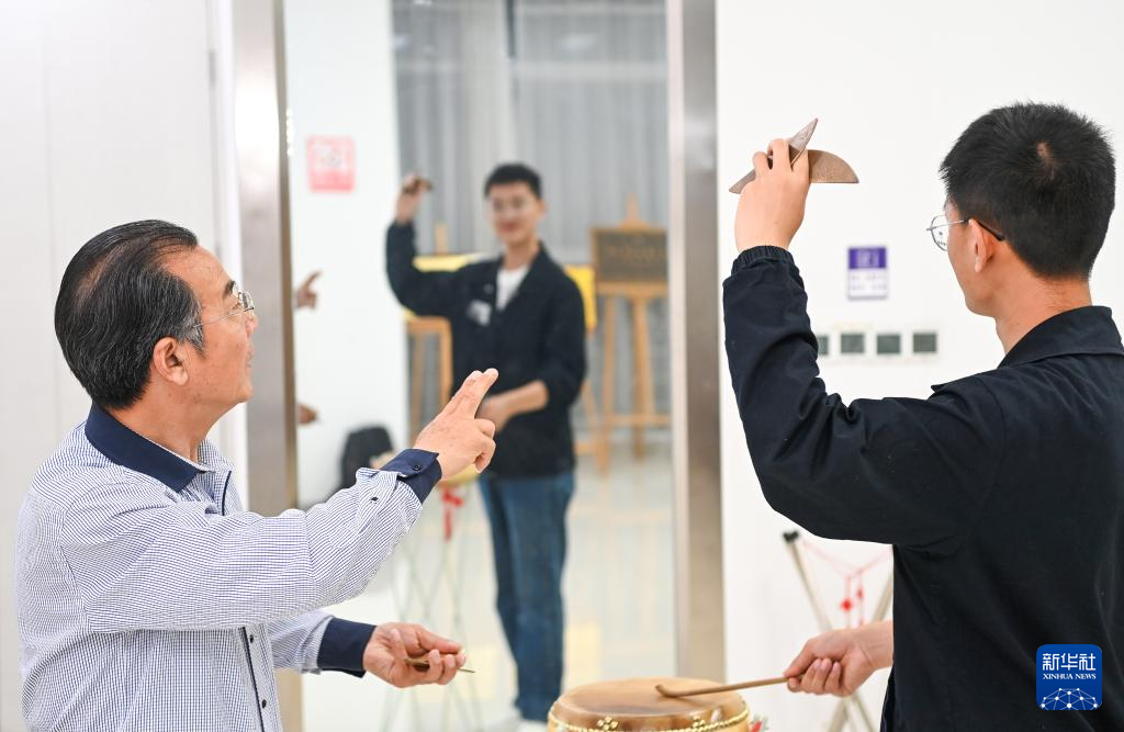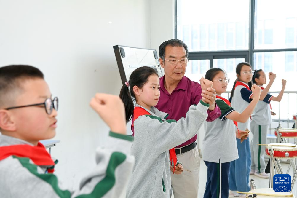 5月12日,宿迁市宿城区实验小学非遗教室内,学生在牛崇祥的指导下学习苏北大鼓。
