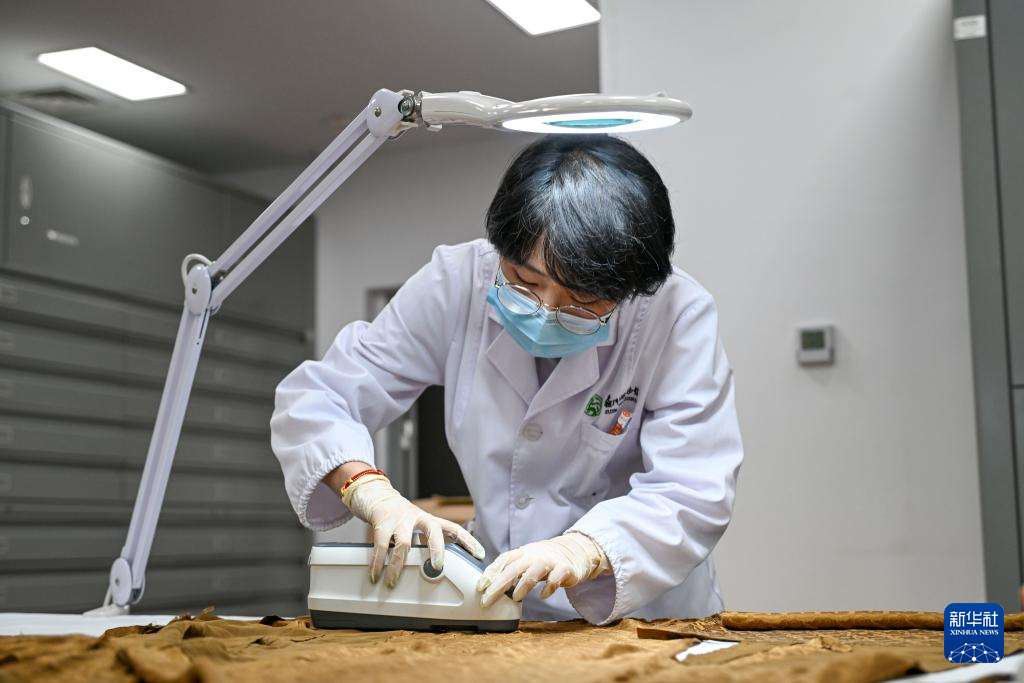 陈琰璐将丝绸文物放置在铁质工作台,使用磁铁为衣物进行平整矫形(5月18日摄)。
