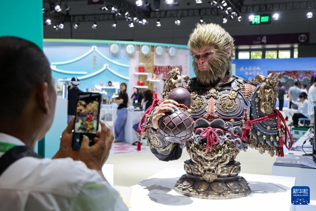5月23日,观众在文博会上拍摄黑神话悟空半身像。