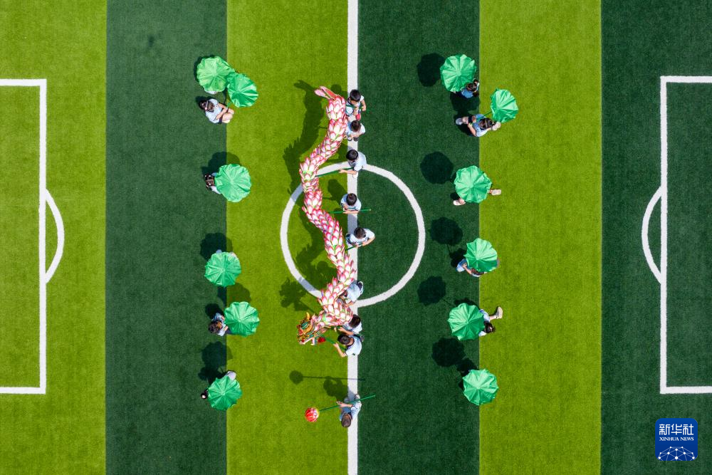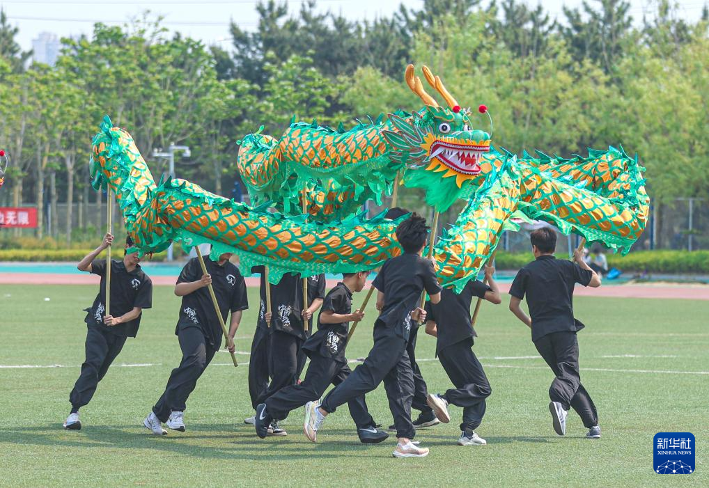 5月27日,山东省荣成市威海海洋职业学院操场上,学生们在进行舞龙表演。