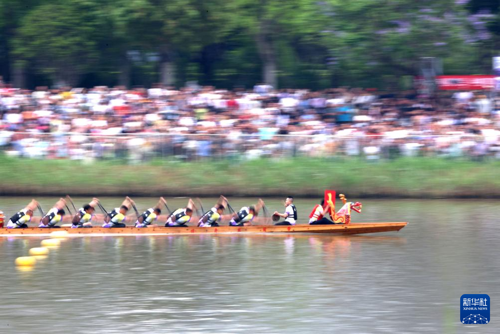 5月25日,在福建省福州市长乐区举行的“两岸同舟·一生长乐”为主题的“2025澎湃洞江湖”龙舟邀请赛中,参赛选手奋力划桨。