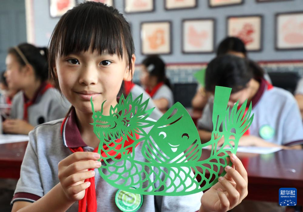 5月26日,在江苏省苏州市胥江中心小学校开展的“传统民俗迎端午”主题剪纸活动,一名学生展示剪纸作品。