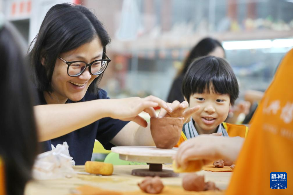 5月25日,在浙江省嘉兴博物馆,南湖实验学校万兴校区一年级小学生和家长一起参加“泥塑悟非遗,亲子迎端午”泥塑制作活动。