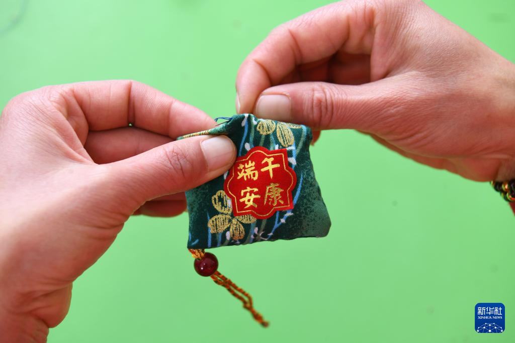 5月27日,河北省邯郸市峰峰矿区临水镇的居民在一起制作香囊。