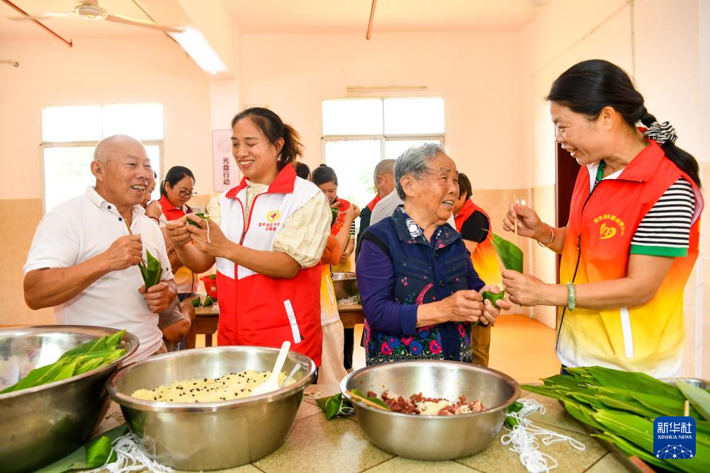 5月26日,江西省宜春市宜丰县新昌镇敬老院,志愿者和老人一起包粽子。