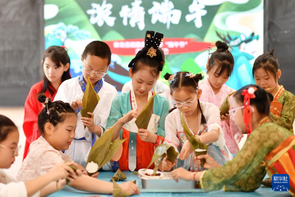 5月27日,在山东省青岛市市北区洛阳路第二小学开展的“浓情端午”主题活动中,学生们学习体验包粽子。