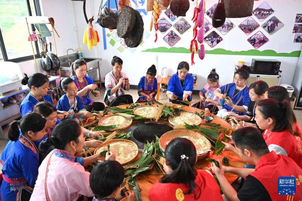 5月23日,在广西柳州市三江侗族自治县古宜镇江川小学,学生、家长一起学习制作三江粽。