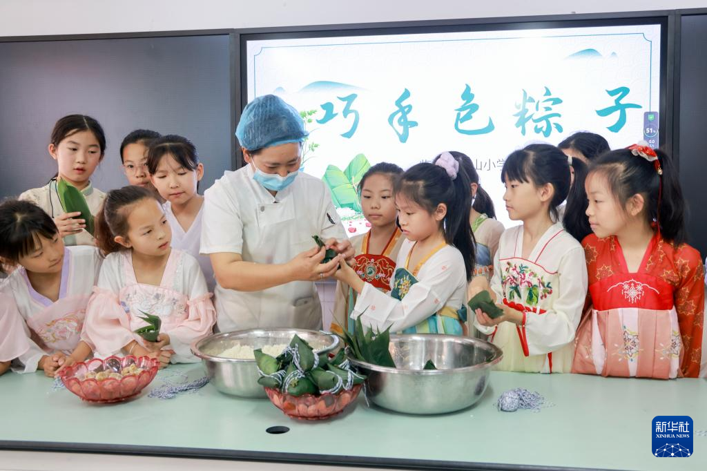 5月27日,在山东省临沂市银雀山小学,食堂阿姨教学生包粽子。