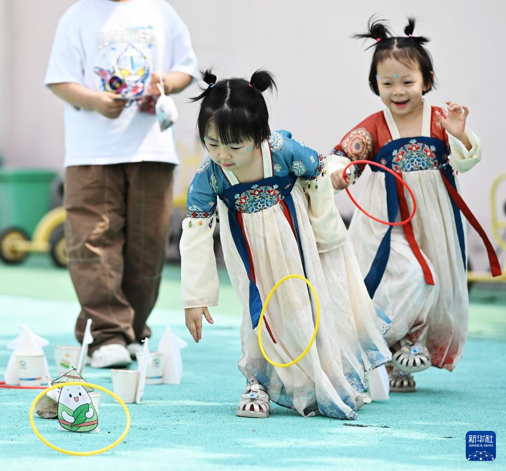 5月27日,小朋友们在山东省滕州市西岗镇中心幼儿园玩“趣味套圈”游戏。