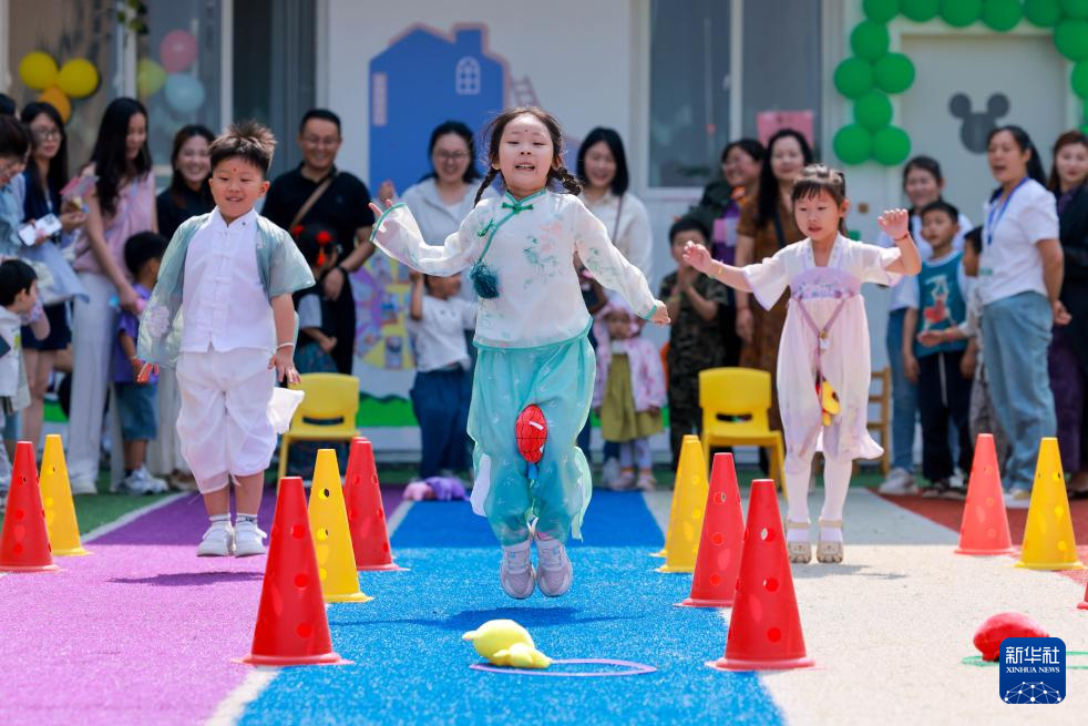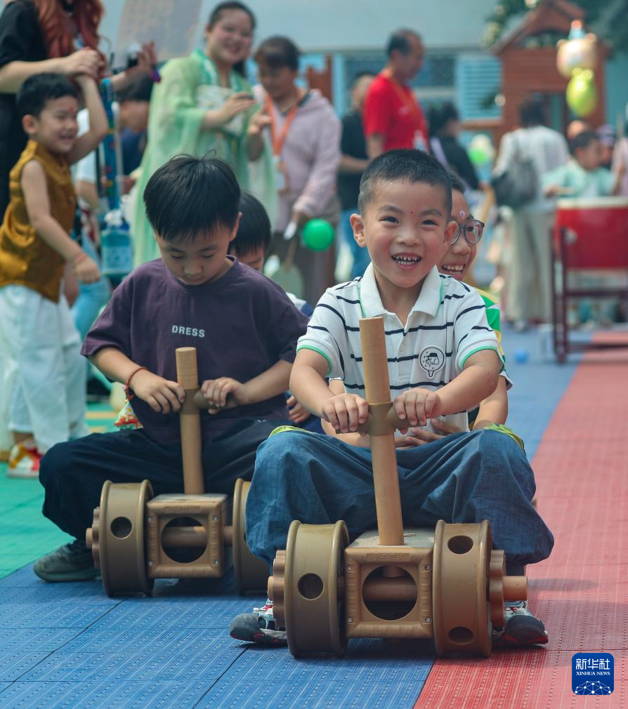 5月28日,河北省石家庄市第三幼儿园的小朋友参加“赛龙舟”游戏。