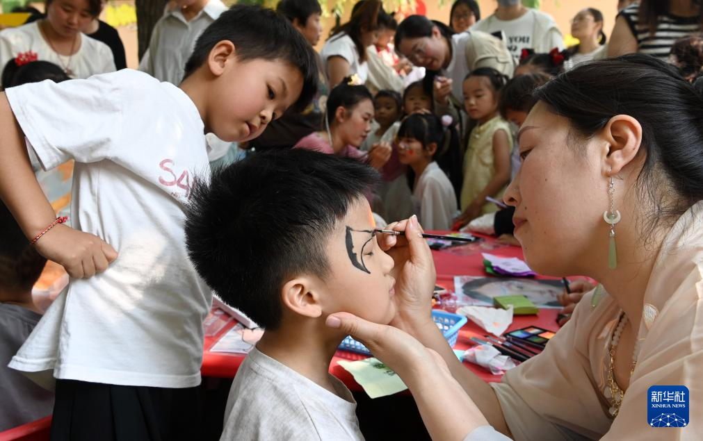 5月28日,在河南省沁阳市白庄村幼儿园,老师为小朋友画面部彩绘。