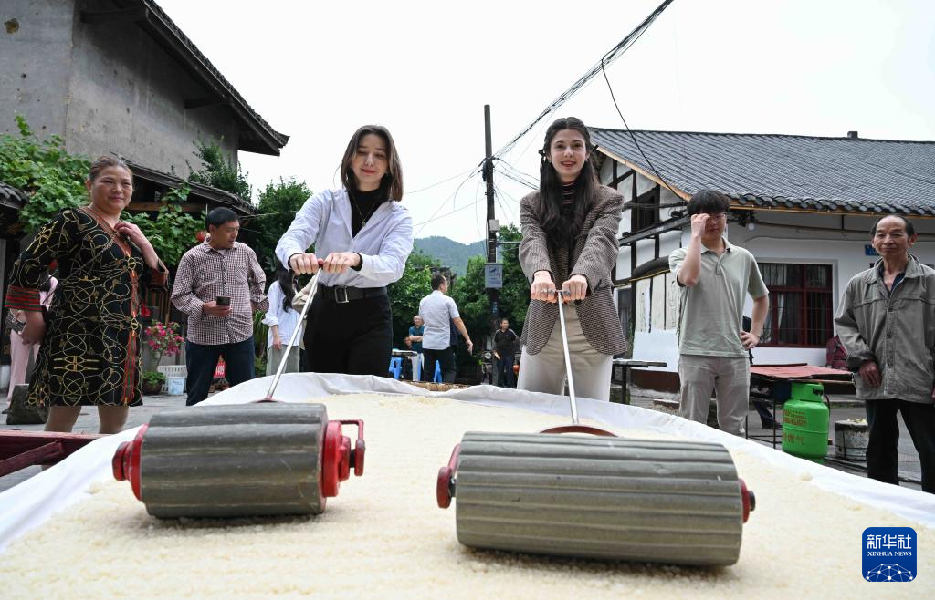 5月28日,在重庆市巴南区丰盛古镇,就读于重庆大学的俄罗斯留学生奥莉(左三)与哈萨克斯坦留学生玛丽(右三)一同体验糍粑的制作过程。