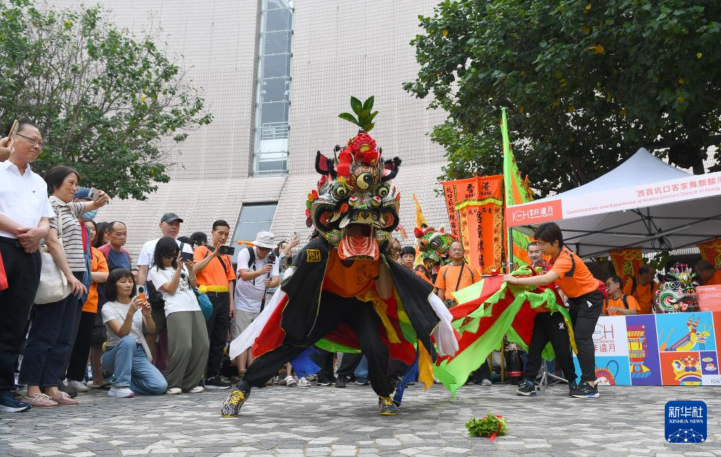 5月31日,演员在香港文化中心露天广场举行的“非遗嘉年华”上表演西贡坑口客家舞麒麟。
