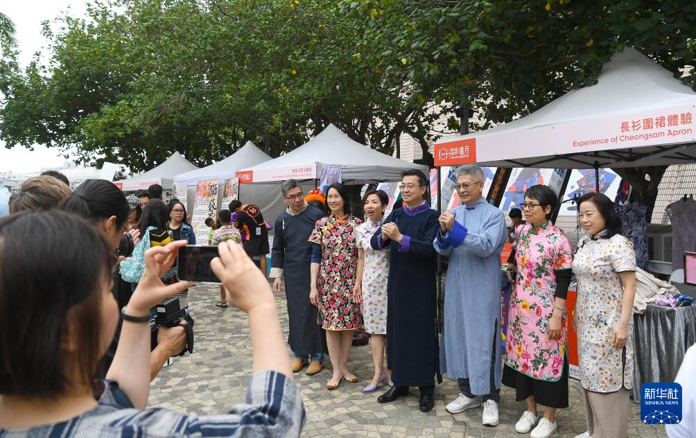 5月31日,在香港文化中心露天广场举行的“非遗嘉年华”上,人们身着旗袍长衫合影。