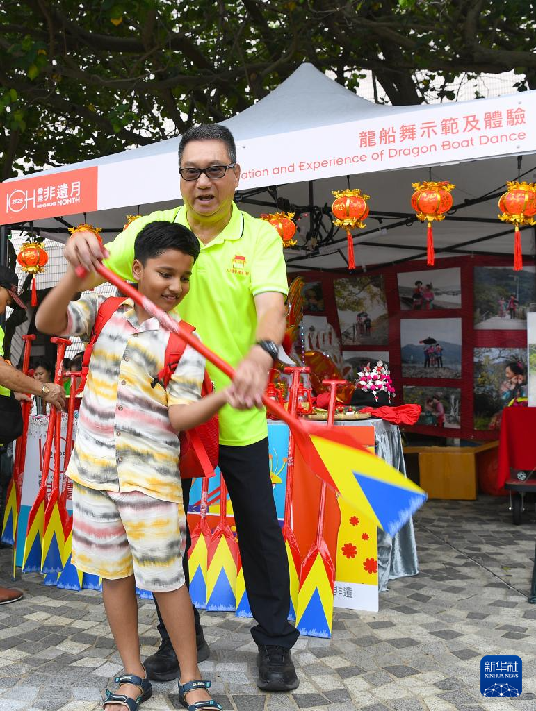 5月31日,一名男孩在香港文化中心露天广场举行的“非遗嘉年华”上体验龙船舞。