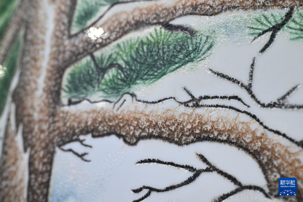 这是陈银付作品瓷刻《迎客松》的局部(6月6日摄)。