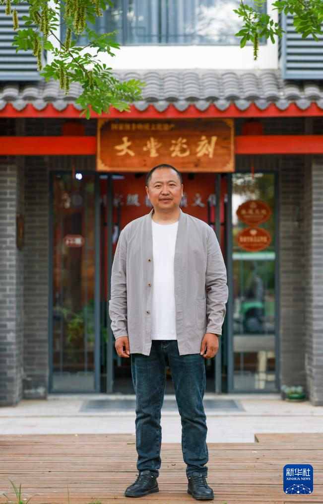 6月6日,陈银付站在江苏盐城大丰瓷刻展示馆前留影。