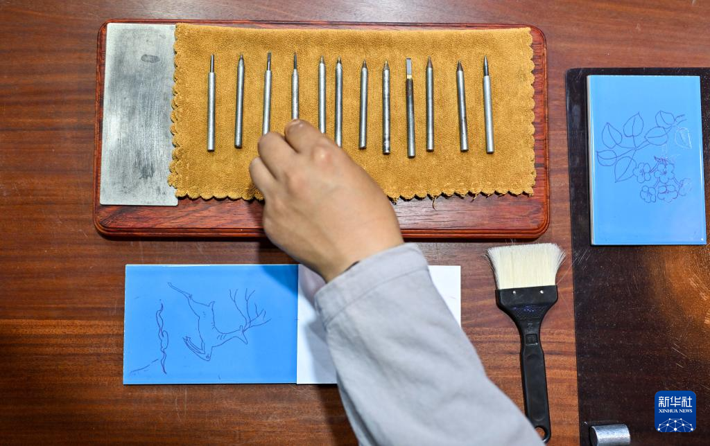 6月6日,在江苏盐城大丰瓷刻展示馆,陈银付进行瓷刻创作时挑选合适的钢凿。