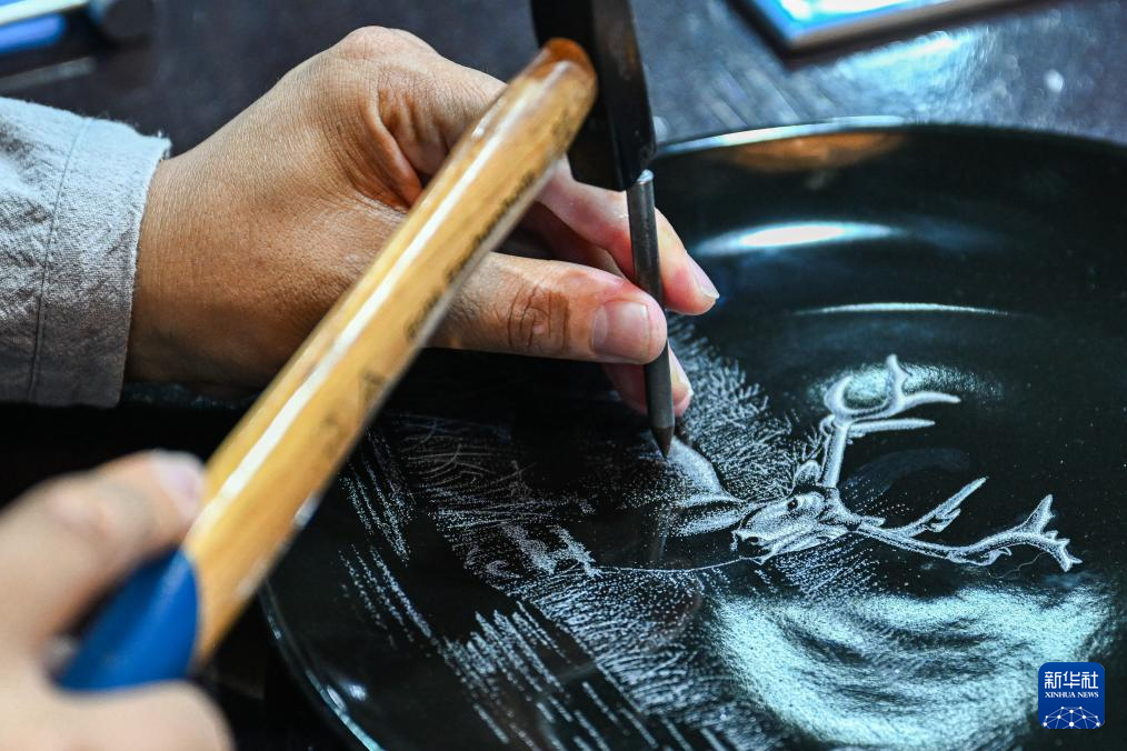 6月6日,在江苏盐城大丰瓷刻展示馆,陈银付进行瓷刻创作。