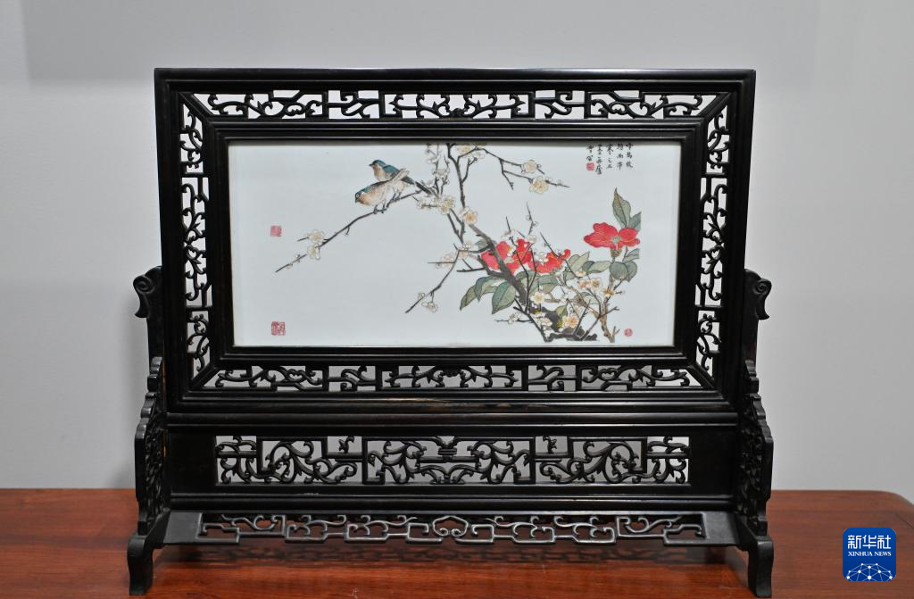 6月6日在拍摄的陈银付的瓷刻作品《啼鸟枝头》。