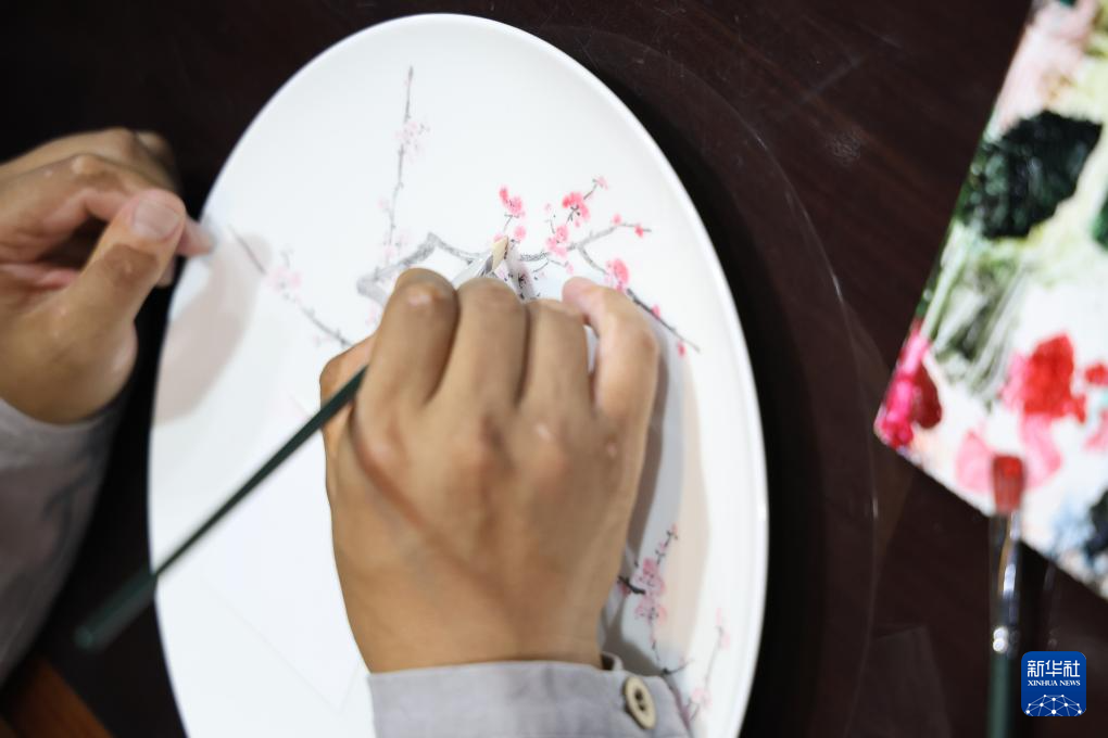 在江苏盐城大丰瓷刻展示馆,陈银付在为瓷刻作品赋色(6月6日摄)。