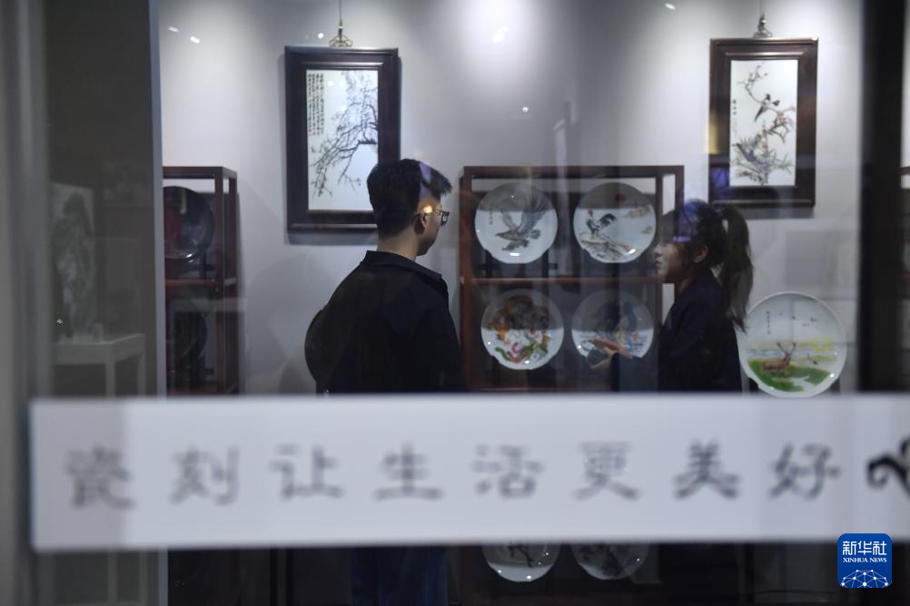 6月6日,在江苏盐城大丰瓷刻展示馆,陈银付的学生崔静蕾(右)为参观者介绍瓷刻艺术品。