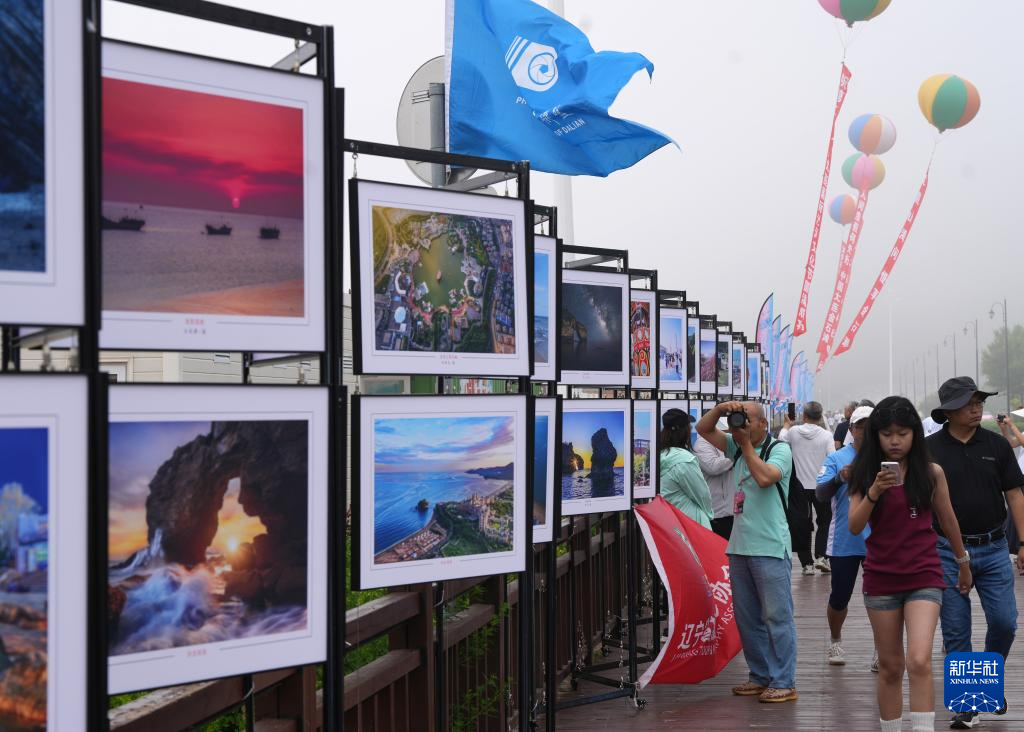 6月28日,游客在大连金石滩快乐海岸观看摄影作品。