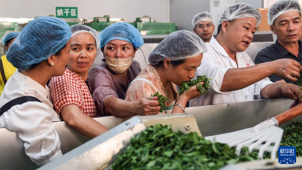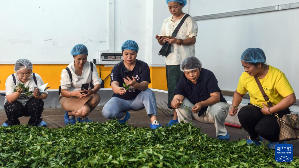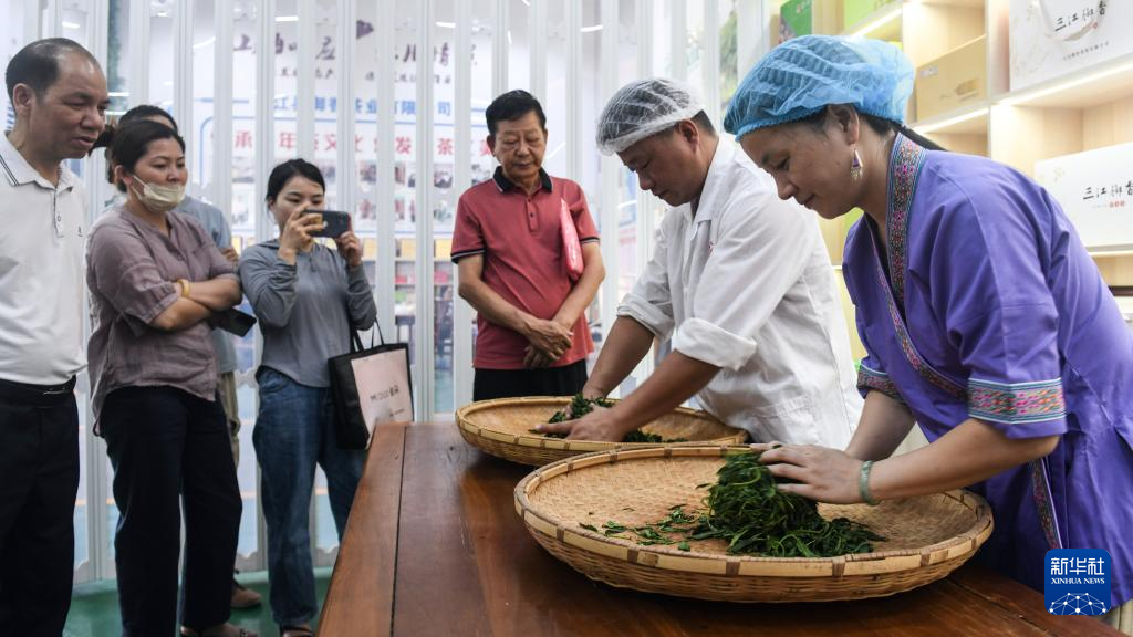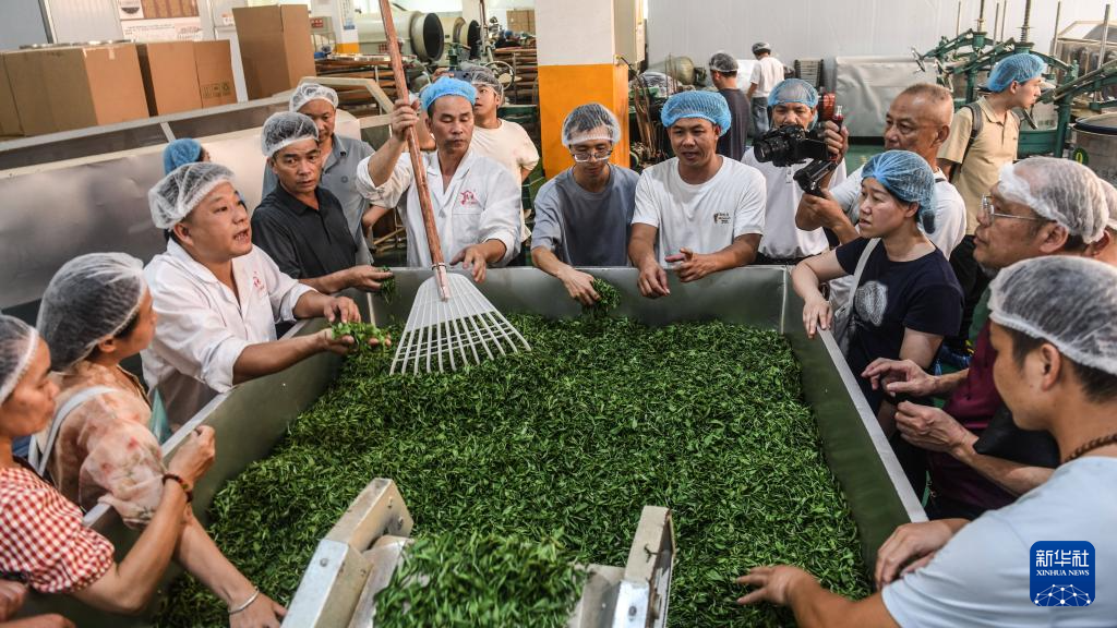 7月11日,制茶匠人在广西三江县御香茶业有限公司生产车间学习比对茶叶“杀青”技艺。
