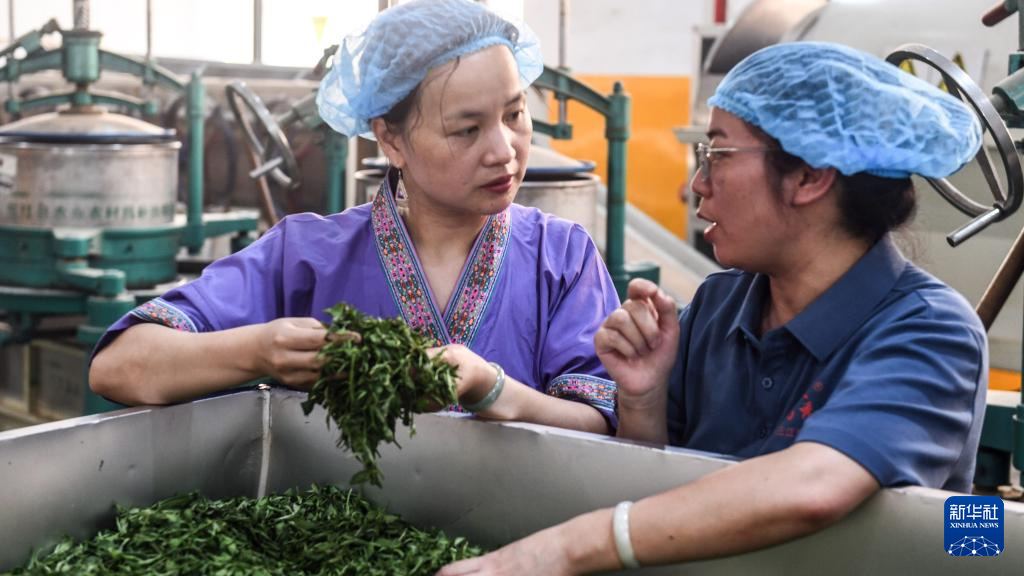 7月11日,两名制茶匠人在广西三江县御香茶业有限公司生产车间交流制茶心得。