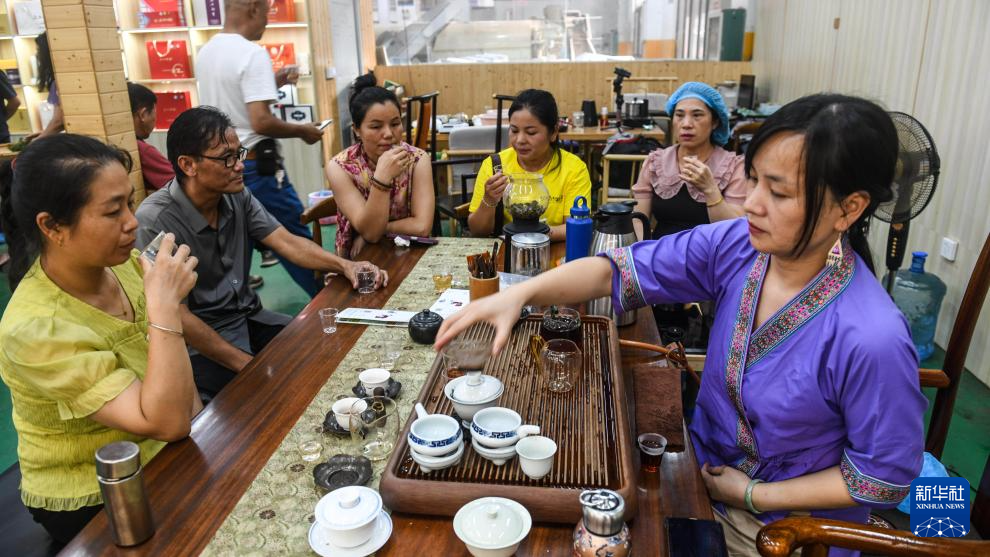 7月11日,制茶匠人在广西三江县御香茶业有限公司品评六堡茶。