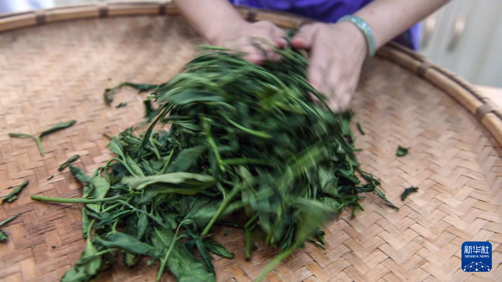 7月11日,制茶匠人在广西三江县御香茶业有限公司生产车间演示茶叶“揉捻”技艺。