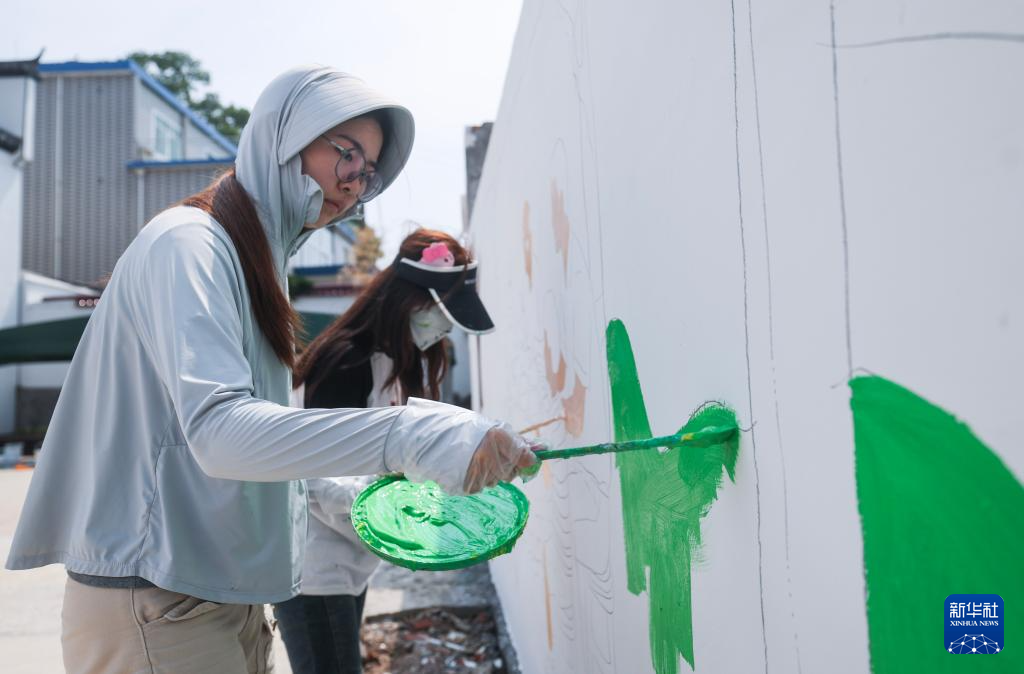 7月15日,在诸暨市安华镇丰江周村,浙江农林大学暨阳学院设计专业的学生们创作墙绘,美化乡村人居环境。