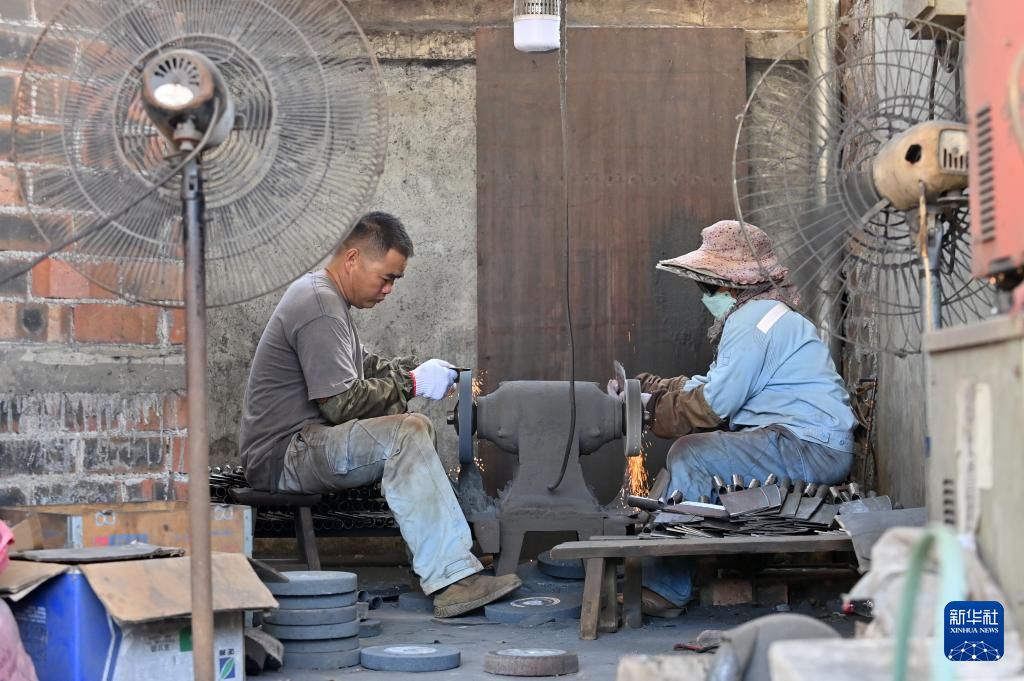 7月16日,广西隆安县雁江镇红良村,村民梁加柄(左)和爱人林玉珍在自己的作坊里打磨菜刀。