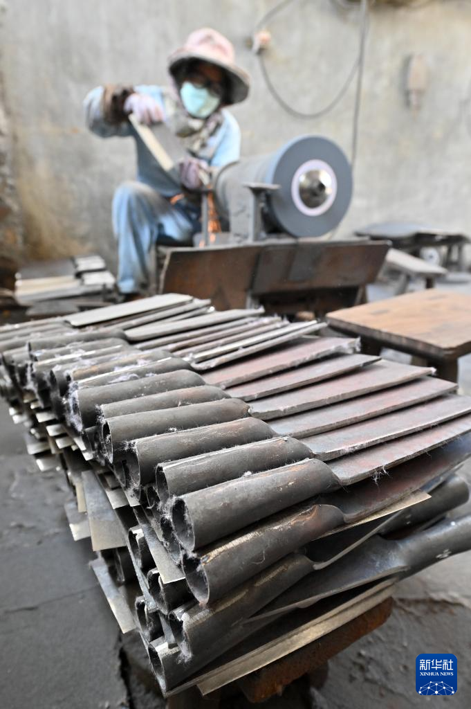 7月16日,广西隆安县雁江镇红良村,村民梁加柄在自己的作坊里打磨菜刀。