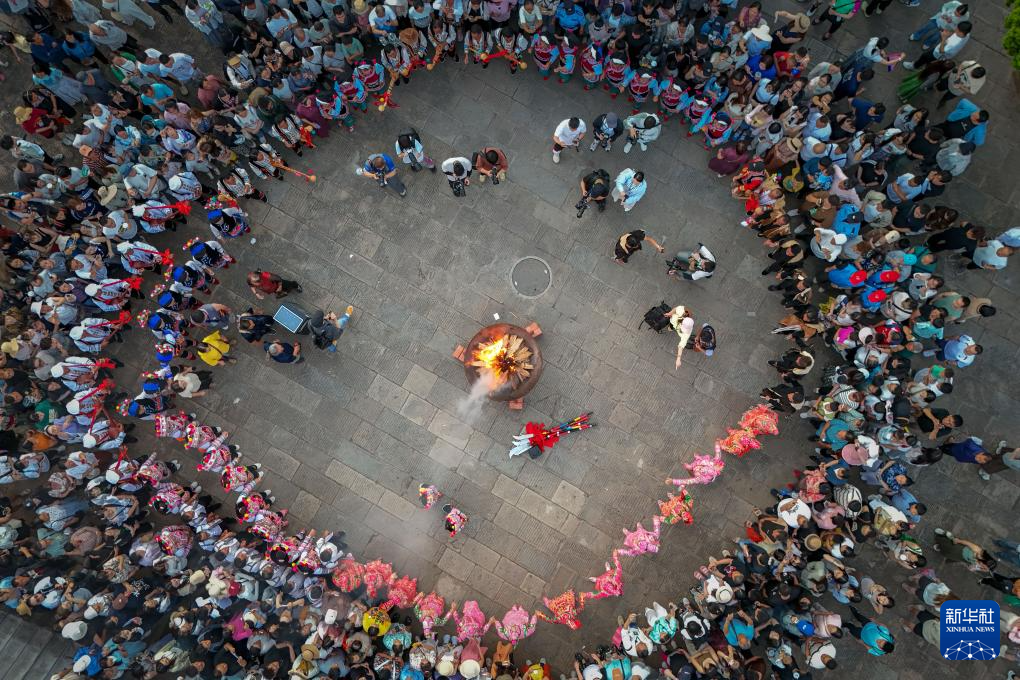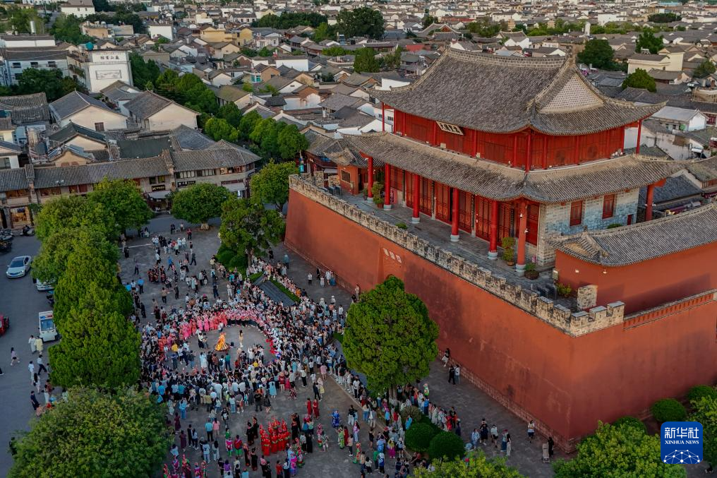 7月18日,彝族打歌队在巍山县拱辰楼广场展演(无人机照片)。