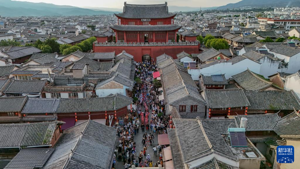 7月18日,彝族打歌队在巍山县南诏古街进行巡演(无人机照片)。