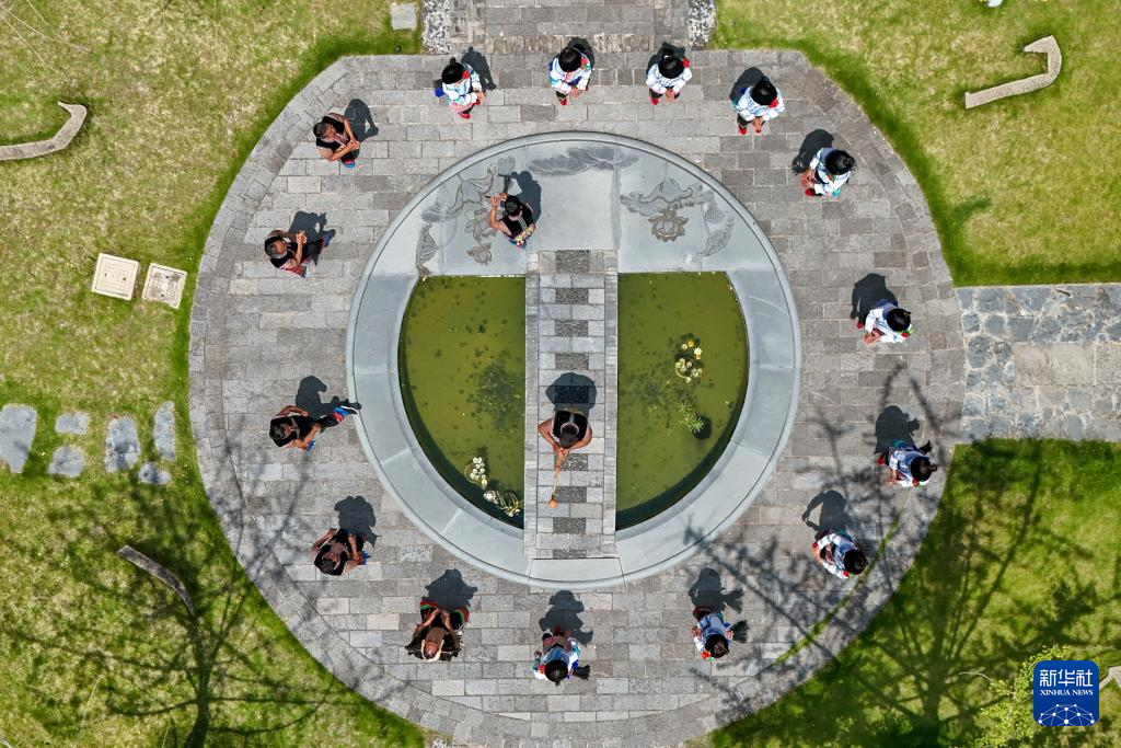 7月18日,彝族打歌队在巍山县文华书院排练(无人机照片)。