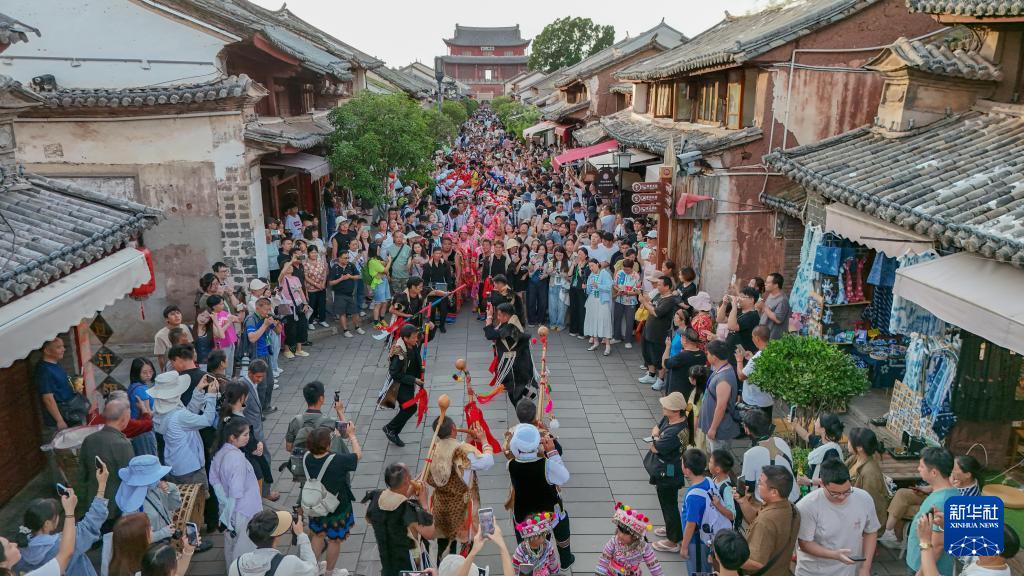 7月18日,彝族打歌队在巍山县南诏古街巡演。