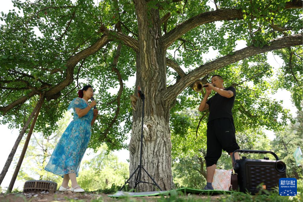 游客弓喜花(左)和赵卫东在田河村的千年银杏树下直播唱歌和吹奏(7月15日摄)。