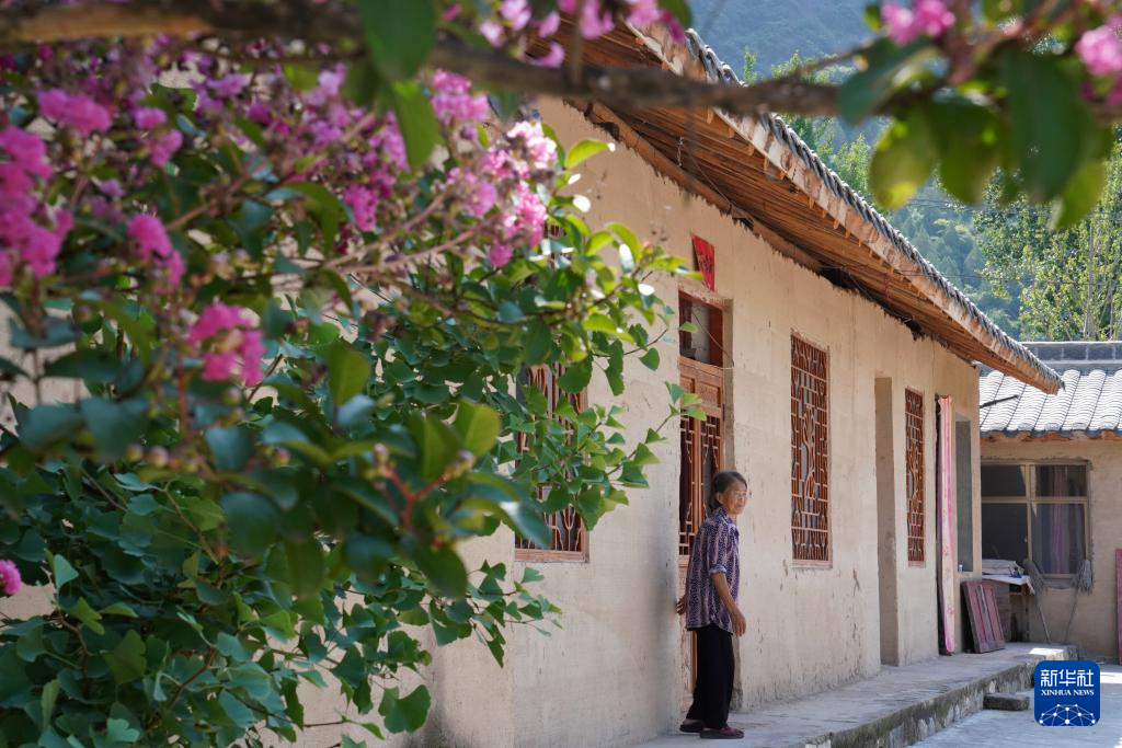 田河村村民马敏在自家院子里提着水壶准备给游客泡茶(7月15日摄)。