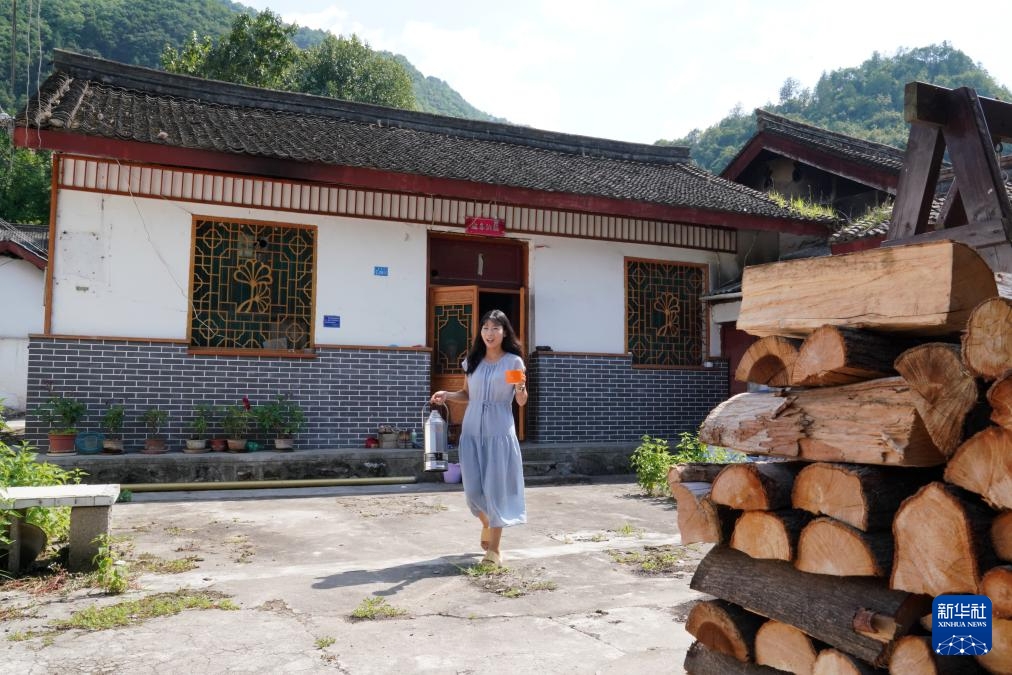 田河村“银杏梦谷”民宿管理者周雅雪在客房里收拾茶具(7月15日摄)。