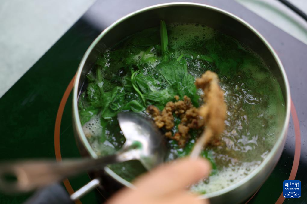 田河村村民杨丽在自家的院子里为游客煮当地特色饮品罐罐茶(7月15日摄)。