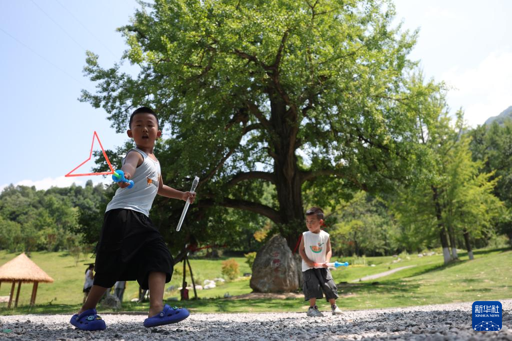 孩子们在田河村的千年银杏树下玩耍(7月15日摄)。