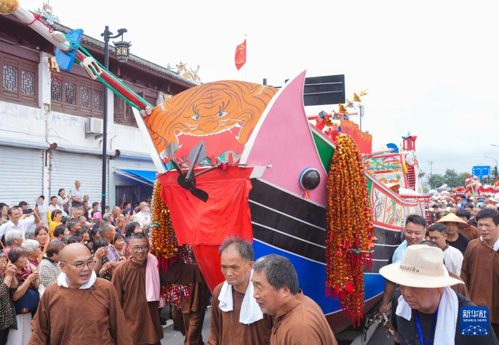 7月22日,当地民众推着“大暑船”沿街游行。