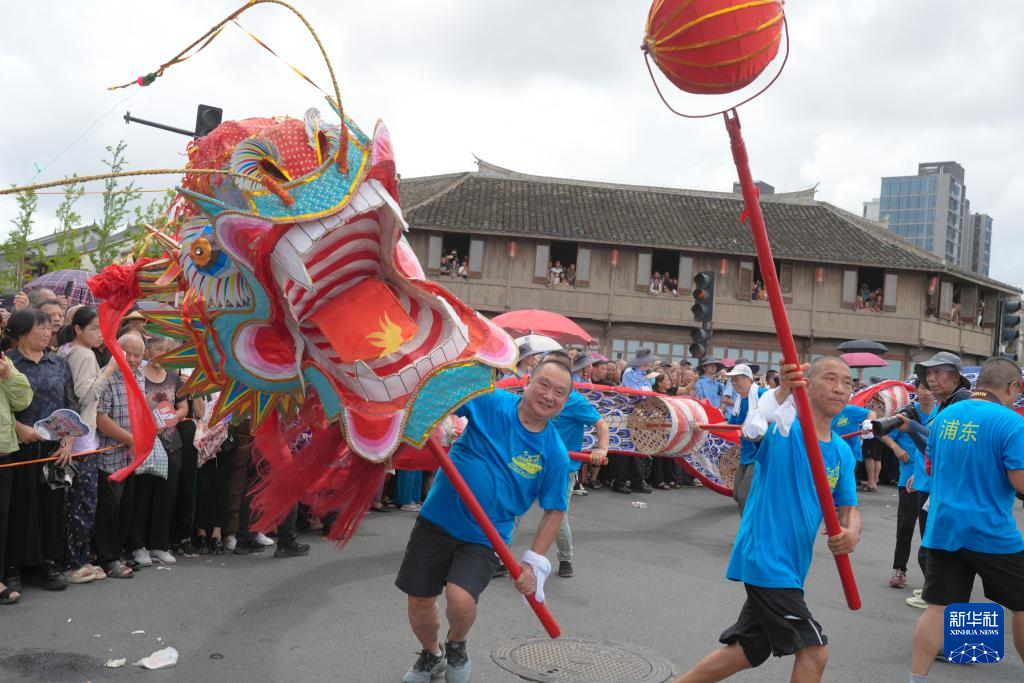 7月22日,当地民众在“送大暑船”的游行队列中进行舞龙表演。