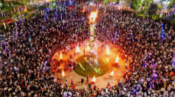 7月17日,在周宁县浦源镇鲤鱼溪景区民俗馆,肖家涨在为游客表演传统制硋技艺。