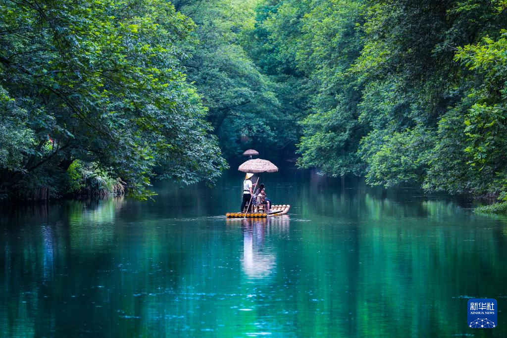8月1日,游客在安徽省黄山市徽州区西溪南景区乘坐竹筏游玩纳凉。